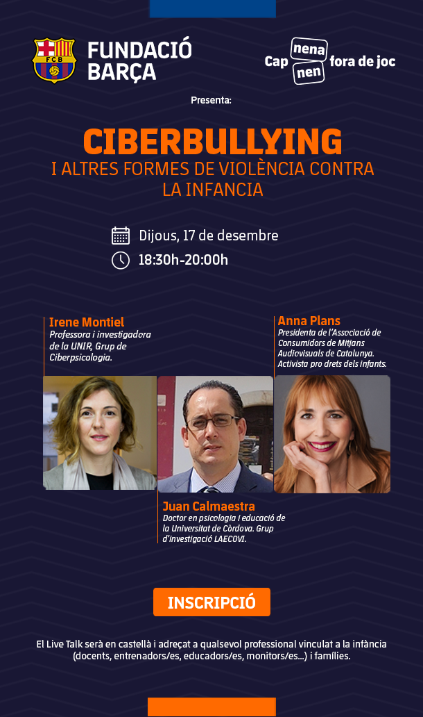 El proper 17 de desembre a les 18.30h tindrà lloc la videoconferència Ciberbullying i altres formes de violència contra la infancia, organtizada per la Fundació Barça. Comptarà amb la presència d’Irene Montiel, Juan Calmaestra i Anna Plans.