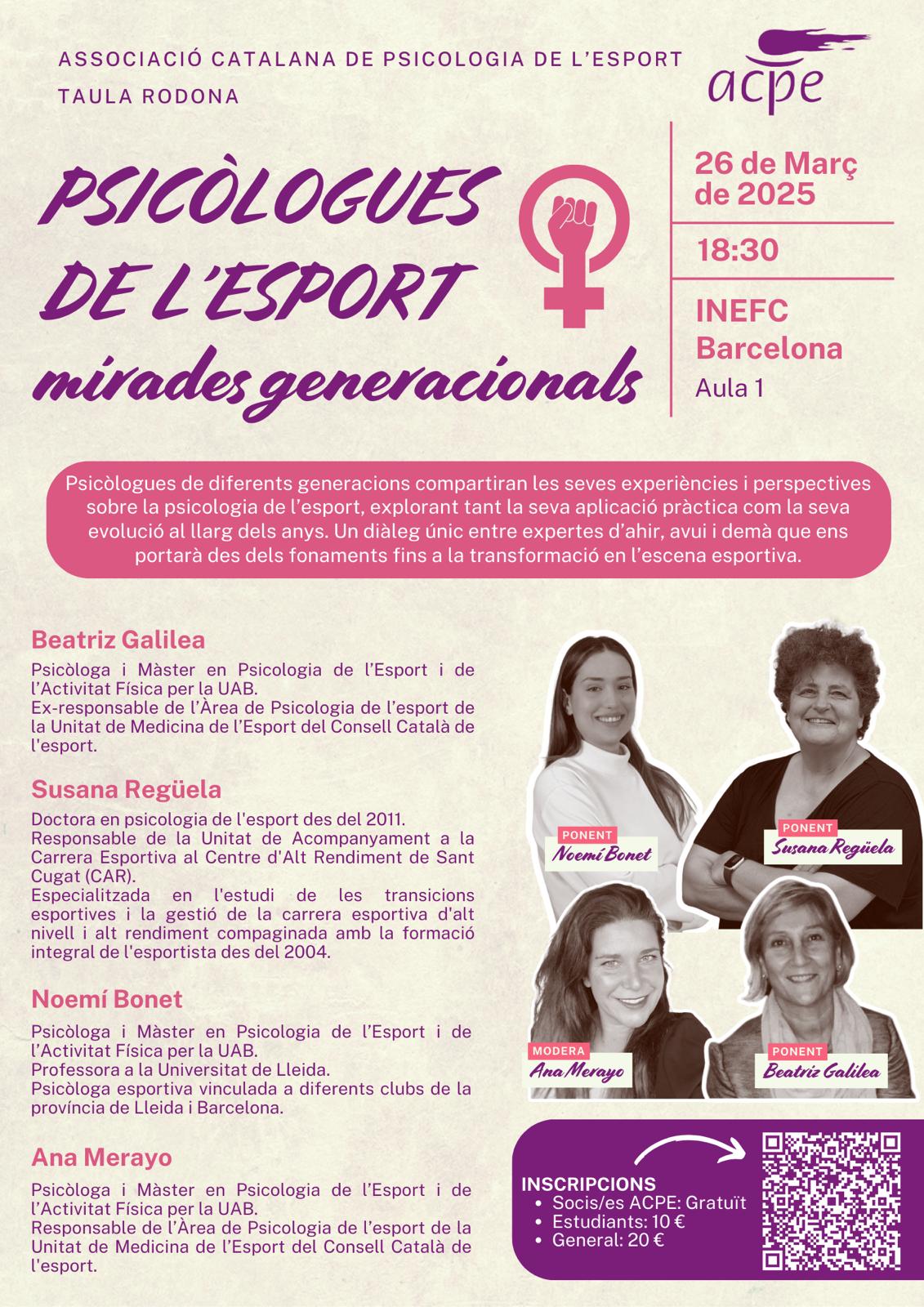 El proper dimecres 26 de març a les 18:30 hores a l’INEFC de Barcelona (Aula 1), l’Associació Catalana de Psicologia de l’Esport (ACPE), coincidint amb els actes vinculats al dia de la dona, portarà a terme una taula rodona amb el títol “Psicòlogues de l’esport: mirades generacionals”. Hi participaran Beatriz Galilea, Susana Regüela, Noemí Bonet, i moderarà Ana Merayo. Exposaran les seves trajectòries i experiències en el camp de la psicologia de l’esport.