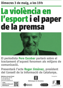 En aquest acte, el periodista esportiu Pere Escobar analitzarà el fenòmen de la violència en l’esport i el tractament que estan donant els mitjans de comunicació. La sessió estarà presentada pel president del Consell de la Informació de Catalunya, Roger Jiménez.