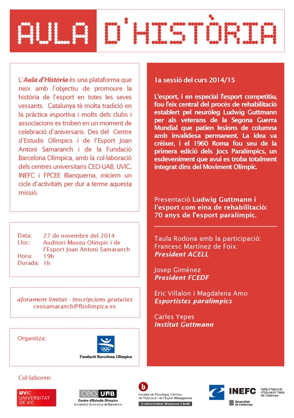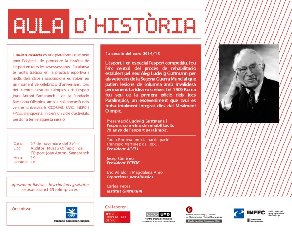 La Fundació Barcelona Olímpica amb la col·laboració de l’INEFC de Barcelona, organitza una jornada el proper dijous 27 de novembre de 2014 dedicada a l’esport paralímpic i la figura històrica de Guttmann.