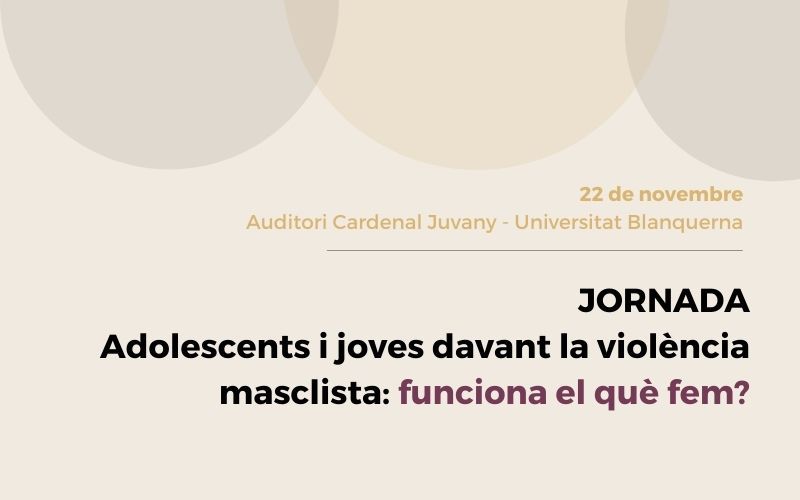 El proper dilluns 22 de novembre, a les 17:30h a l’auditori Cardenal Juvany de la Facultat de Psicologia, Ciències de l’Educació i l’Esport de la Universitat Blanquerna (Universitat Ramon Llull), se celebrarà una jornada presencial dins del marc del projecte PUJA i que porta per títol Joves i Adolescents davant la Violència Masclista: funciona el què fem?. La Jornada està organitzada per l’Associació CONEXUS, conjuntament amb Blanquerna – Universitat Ramón Llull.