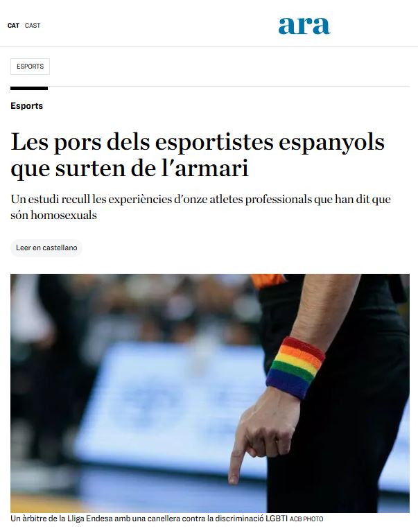 L’article “‘Yes, I’m an Elite athlete and I’m Gay’: Experiences of elite gay male athletes in Spain”, d’Anna Vilanova, Pablo Kopelovich, Pedrona Serra i Joaquín Piedra s’ha publicat a la International Review for the Sociology of Sport. El diari ARA ha parlat sobre l’estudi en l’article de premsa: Les pors dels esportistes espanyols que surten de l’armari.